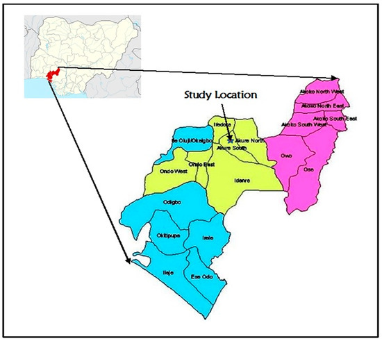 Field experiments were conducted during three consecutive dry seasons of 2016 (January–April), 2017 (February–May) and 2017/2018 (November–February) at the Teaching and Research Farm of the Department of Agricultural and Environmental Engineering, Federal University of Technology, Akure. The site is located at latitude of 7°16′ N and longitude 5°13′ N. A map describing the experimental site location is shown in Figure 1.