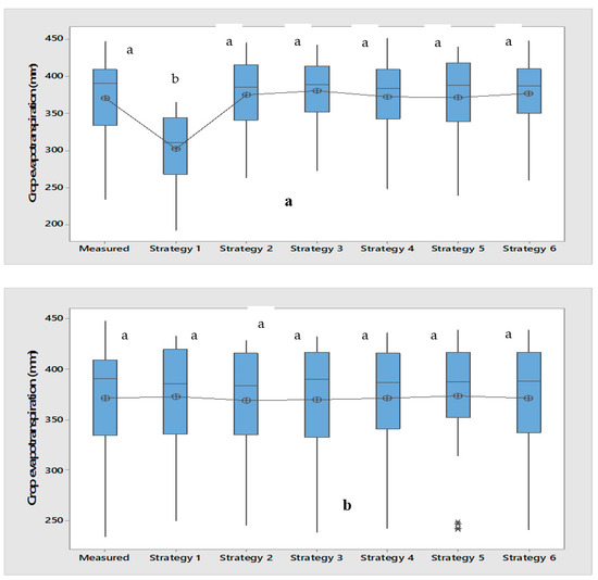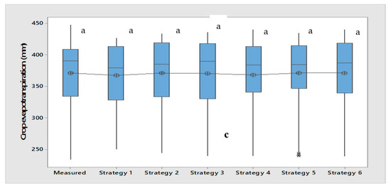 Comparison between overall modelling and the measured result for (a) MLR, (b) ANN-Logsig and (c) ANN-Tansig of maize crop evapotranspiration. Note(s): Means that do not share a letter in rows are significantly different.