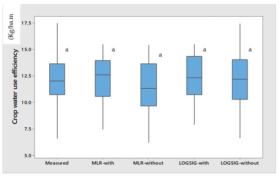 Comparison between the average value of the overall modelling and the measured result for MLR and ANN-Logsig with and without crop data for the crop water use efficiency of maize. Note(s): Means that do not share a letter in rows are significantly different.