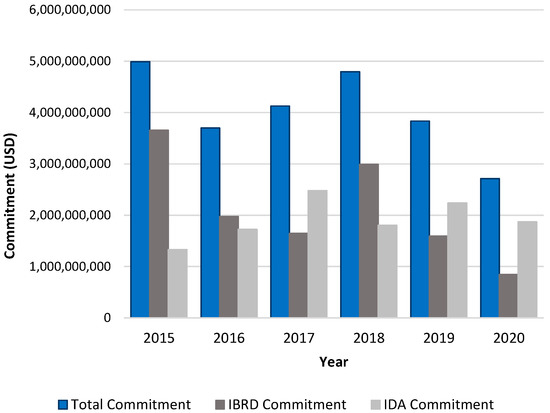 Thus, the 2020 results, when compared with the previous 5 years, deviated from the norm/trend. However, even though it is tempting to attribute these changes solely to the COVID-19 world pandemic crisis, it should be considered that the commitments from the World Bank are planned and agreed upon prior to their actual application. Thus, since the pandemic was only declared by the World Health Organization on 11 March 2020 [37], it is unwise to establish a direct correlation between the types and amounts of commitment that were allocated in 2020 and the COVID-19 world pandemic.