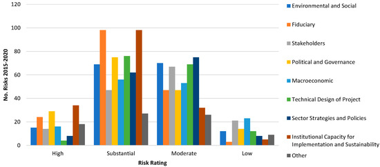 The various types of risks rated by the World Bank were identified in most of the projects; more specifically, between 2015 and 2020, the environmental and social risk was rated in 166 projects; fiduciary risk in 172 projects; stakeholders risk in 149 projects; political and governance risk in 165 projects; macroeconomic risk in 148 projects; technical design of project risk in 161 projects; sector strategies and policies risk in 153 projects; institutional capacity for implementation and sustainability risk in 169 projects; and other risk categories in 80 projects.