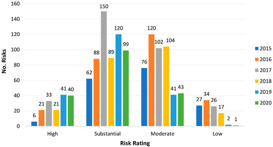 The number of risks identified per rate in each year is shown in Figure 3. It can be observed that, while the amounts committed each year have been decreasing (as previously mentioned), the number of project risks rated as “high” and “substantial” has been increasing since 2015.