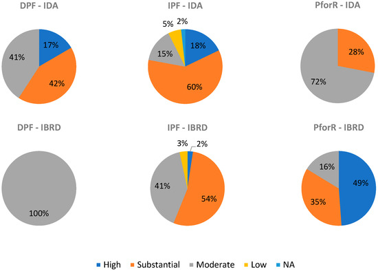 Through the analysis of Figure 5, it was highlighted that for DPF most of the IDA’s commitment went to substantial risk-rated projects (42%), while all of the IBRD’s commitment went to moderate risk-rated projects; for IPF financing the majority of the IDA’s and IBRD’s commitment benefited substantial risk-rated projects (60% and 54%, respectively); and for PforR most of the IDA’s commitment went to moderate risk-rated projects (72%), while a big proportion of the IBRD’s commitment benefited high risk-rated projects (49%).