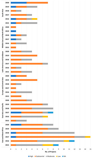 The clear differentiation between regions was also made evident when analyzing the projects according to their year of approval. Thus, Figure 6 shows historical regional data by presenting the yearly number of projects financed by the World Bank divided according to their average risk rating and region of application. Its analysis showed, for example, that from 2015 to 2020 the World Bank only financed Latin America and Caribbean projects with an average risk rating of moderate or substantial, while in South Asia several of the financed projects had a high risk rate.