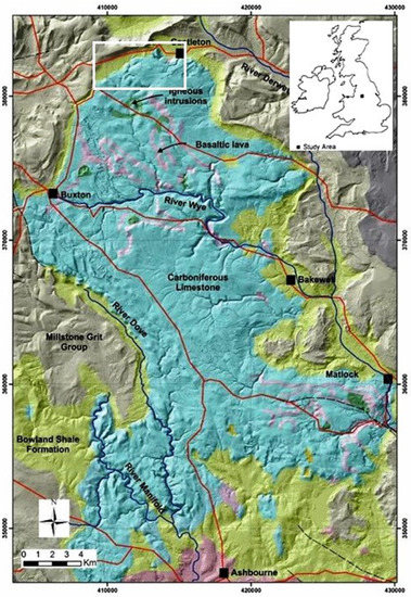 - Gunn, J. Groundwater in Carboniferous Carbonates: Field Excursion to the Derbyshire "White Peak" District 26th June 2015. In Proceedings of the KG@B 2015, International Conference on Groundwater in Karst, Birmingham, UK, 20–26 June 2015; pp. 1–34. Available online: http://nora.nerc.ac.uk/id/eprint/511287/ (accessed on 1 April 2023).