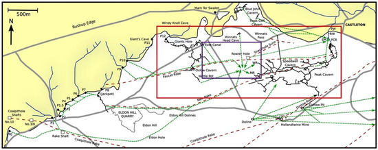 The Castleton karst system showing surface drainage on the Millstone Grit (yellow shading) to the north, and the sub-surface conduit network in the Carboniferous Limestone. Black lines are surveyed cave passages, and green lines show hypothetical pathways of links proven by dye tracing. The red lines show fault-aligned mineral rakes. The conduit network in the red rectangle is illustrated in Figure 3, and the area in the purple rectangle is shown in Figure 4.