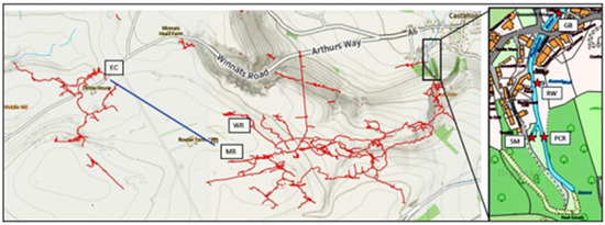 The Giant’s Hole (left) and Peak–Speedwell cave systems and location of underground and surface monitoring sites. EC = East Canal; MR = Main Rising; WR = Whirlpool Rising; PCR = Peak Cavern Resurgence; SM = Slop Moll; RW = Russet Well; GB = Goosehill Bridge. Blue line shows location of cross-section in Figure 4. Main figure is from https://peakdistrictcaving.info/home/the-caves/castleton/map, accessed on 15 April 2023. Inset is from Digimap (© Crown copyright and database rights 2023 Ordnance Survey (100025252)).