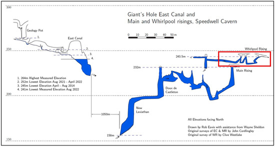 A similar mechanism has been proposed to explain episodic discharge from Big Spring in Kings Canyon National Park, CA, USA [9,10,11]. Water depth observations in the Z Room, Lilburn Cave and discharge measurements at the spring “suggest a single conduit containing a sediment plug in the lowest sump that stochastically blocks the flow path creating ebb and flow discharge cycles. A larger cross-sectional area is present above the sump that retains most of the sediment because of a lower velocity“ [10] (p. iv). The latter observation is relevant to MR, as at its furthest explored point, 74 m below the rising, water has been described as ‘boiling-up’ through a floor of liquid sand from a slot around 2 m wide [18], and from this point the water rises vertically 40 m up the New Leviathan shaft (Figure 4). Observations following flood events of fresh sand deposited in the Speedwell Cavern vadose streamway downstream of MR demonstrate that in these events some sediment is mobilised and evacuated from the sump. However, during smaller events the velocity may be sufficient to mobilise sand-sized sediment, but the flow is insufficient to carry it to the top of the shaft(s), and the sediment will settle as the velocity falls. Any sediment lost from the phreatic conduits will be replaced by inputs from the allogenic streams [23].