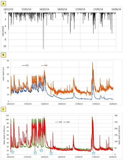 (A) Hourly precipitation (mm) and (B) two-minute water depths at PCR, RW, SM, WR, and MR for the 72-h from 14:00 on 18 December 2013. (C) Two-minute water depths at MR and WR for 8 h from 04:00 on 19 December 2013 (there was 0.3 mm precipitation between 09:00 and 10:00).
