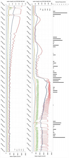 During this period, the depth at EC increased by >2 m in two events, which are also seen at MR and RW and appear to be in response to rainfall, although there was no change in depth at WR and PCR. In the first event, the depth at EC started to rise at 10:16 on 9 May; at MR, the rise began at 10:50, and at RW the rise began at 11:32. In the second event, the delay between the two sites was markedly less, as the depth rise began at 02:28 10 October (EC), 02:30 (MR) and 03:00 (RW) with peaks at 09:10 (EC) and 10:04 (MR). Unlike in other events, the depth at RW did not rise to a clear peak but reached a plateau between 09:52 and 10:30. At all three sites, there is a steady recession which ends at 13:12 (EC), 13:16 (MR) and 13:30 (RW). Between these times and 11 May at 01:20 (EC), 01:32 (MR) and 01:46 (RW), there were six smaller rhythmic peaks and troughs.