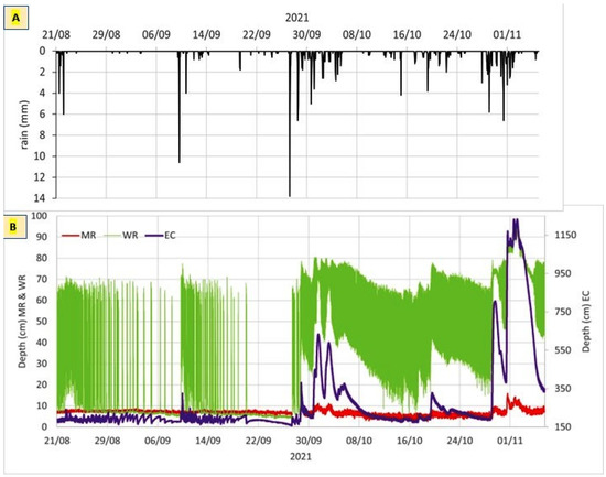 (A) Hourly rainfall and (B) 2-min water depths at East Canal (EC), Main Rising (MR) and Whirlpool Rising (WR) (B) from 21 August to 6 November 2021.