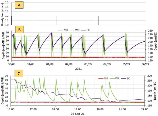 (A) Hourly precipitation (circles are the actual data points) and (B) water depths at East Canal (EC), Main Rising (MR) and Whirlpool Rising (WR) from 27 September to 3 October 2021. (C) shows more detail for the 1 October.