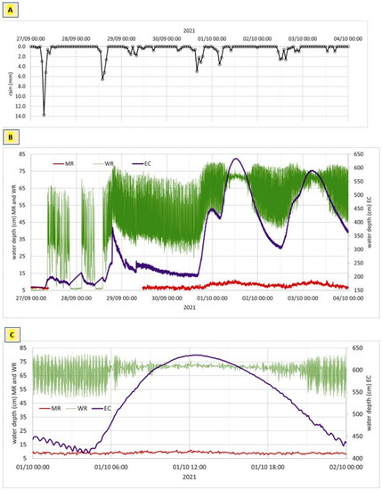 Water depths from 30 August to 5 September 2021 are shown in Figure 12A. Over this period variations in water depth at MR were less than +/− 1 cm, the accuracy of the logger. At EC there were 10 peak–trough cycles, details of which are provided in Table 2. In all cases, the rate of fall was more rapid than the rise, but there was no consistent pattern. The frequency of peaks (time between successive peaks) ranged from 3 h 58 min to 27 h 48 min, and the trough frequency ranged from 6 h 00 min to 28 h 16 min; the rates of rise and fall, respectively, ranged from 0.03–0.09 and from 0.14–0.58 cm/min. Within 2 min of each peak at EC, the water depth at WR began to rise and enter a rhythmic cycle that continued until the next EC trough. Within 2 min of each EC trough, the water depth at WR began to fall, and this ended when the depth reached a base level or declined very slowly until the next EC peak. In eight of the nine WR base level periods, the duration was 26–36 min, less than the EC rise time (Table 2), but during event 5 the rate of fall at WR was much slower than in the other events, and consequently, the base level duration was 122 min less than the EC rise time. The frequency and amplitude of the rhythmic cycles at WR, which occurred while the depth was falling at EC, varied between events, but detailed analysis (e.g., Figure 12B) shows that small peaks and troughs were superimposed on the overall EC recession and that each minor EC peak coincided with a WR trough and each minor EC trough coincided with a WR peak.