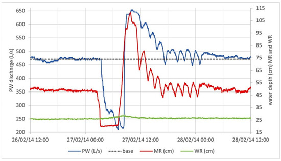 Water depth at MR and WR and discharge of PW, 12:00 26 February to 12:00 28 February 2014 (for precipitation, see Figure 8).