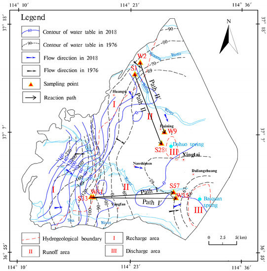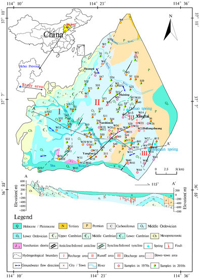 - Liu, Y.X.; Liang, Y.; Qiao, L. Analysis on water-rock reaction characteristics of groundwater system in Xingtai-Baiquan springs. S. N. Water Transf. Water Sci. Technol. 2009, 7, 63–66, (In Chinese with English abstract). [Google Scholar]