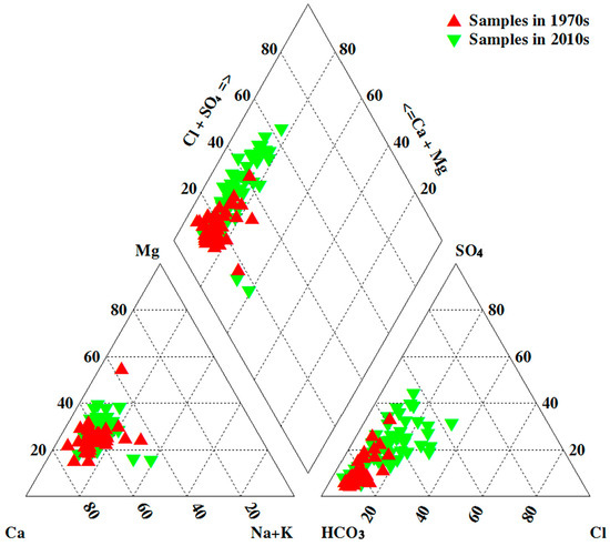 To meet the needs of urban development, large-scale utilization of karst groundwater in the study area began in the 1980s [31,37]. Figure 2 shows that the milliequivalent concentration percentage ranges of Ca2+ and Mg2+ in most water samples before the 1980s were 50–75% and 15–30%, respectively, and the hydrochemical types were HCO3-Ca and HCO3-Ca·Mg types on the whole. Only the relative contents of Mg2+ or SO42− in a few water samples were slightly higher, with HCO3-Mg·Ca and HCO3·SO4-Ca·Mg types forming, respectively. In contrast, the relative contents of Cl− and SO42− in the water samples collected in recent years significantly increased, and the percentage ranges of Ca2+ and Mg2+ changed to 45–70% and 15–40%, respectively, which resulted in a significant reduction of HCO3-Ca-type water and the appearance of SO4·HCO3-Ca·Mg, HCO3·Cl-Ca·Mg, HCO3·Cl·SO4-Ca·Mg, and HCO3·SO4-Ca types, indicating the complexity of the hydrochemical components.