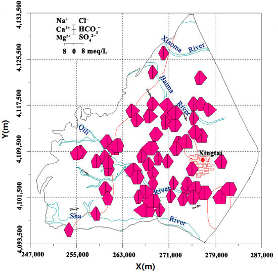 In this study, concise and easy-to-understand graphical tools were selected to determine the hydrochemical spatiotemporal characteristics of the groundwater samples and facilitate further research. A Piper diagram [50] is a common graphical tool for hydrochemistry consisting of two triangles and a diamond. The triangles on the left and right represent the milliequivalent concentration percentages of the major cations and anions, respectively. The leads of the points plotted on the two triangles intersect the upper diamond and the different zones represent different chemical characteristics [50]. On the other hand, the Stiff polygon diagram [51] is a graphical tool used to visually represent the milliequivalent concentrations of major anions and cations at each sampling point. In this study, Stiff polygon diagrams were combined with sampling locations to analyze the spatial evolution of major ion concentrations. The hydrochemical diagrams drawn in the study were realized using Aquachem 5.1 (Waterloo Hydrogeologic Inc., Waterloo, Canada), a software for hydrochemistry.