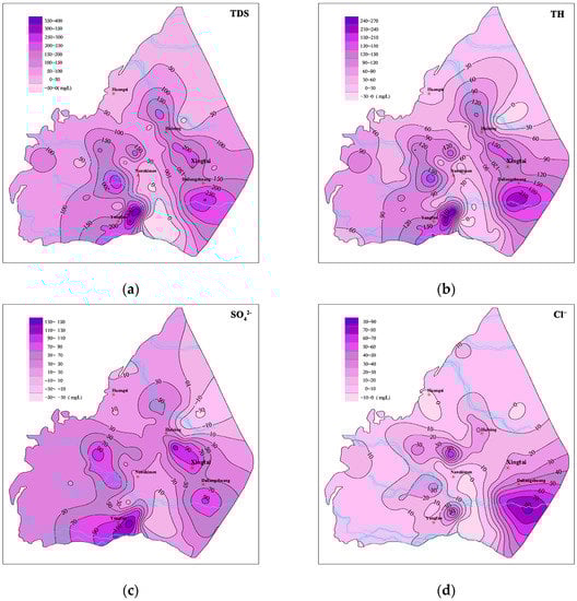 In addition, the Kriging interpolation method, which is one of the widely used geostatistical interpolation methods [52,53], was applied to interpolate the concentrations of hydrochemical parameters. In this study, contour maps of the increases in the concentrations of major hydrochemical parameters over the past decades were calculated using the Kriging interpolation method in MapGIS 6.7 (Zondy Cyber S&T., Wuhan, China).