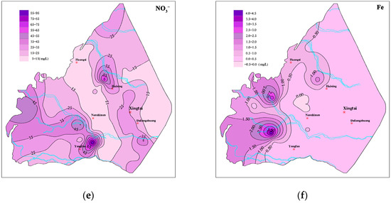 Among the other main components in Table 1, the maximum value of F− in the water samples taken from 2018 to 2019 was 0.69 mg/L, which is lower than the value for drinking water (1.5 mg/L) recommended by the World Health Organization (WHO) [59]. The minimum value of F− was 0.30 mg/L and the variation coefficient was lower than that of the 1970s period, indicating that F− is widely present in karst groundwater in recent years, with a little difference in the concentration. In the water samples collected during the 1970s, the NO3− and Fe concentrations did not exceed the relevant standards. However, in the samples of the 2010s period, the maximum value of NO3− (105.40 mg/L) exceeded the WHO guideline value (50 mg/L) [59] and the limit value (88.6 mg/L) of the PRC National Standard [58]. In addition, the mean value of Fe (0.476 mg/L) also exceeded the limit value (0.3 mg/L) of the PRC National Standard [58], with an over-limit ratio of 39.3% and a variation coefficient of 164.43% (Table 1). These statistics show that the phenomenon of Fe and NO3− exceeding the limits is noteworthy and that the concentration distribution of Fe exhibits notable regional differences.
