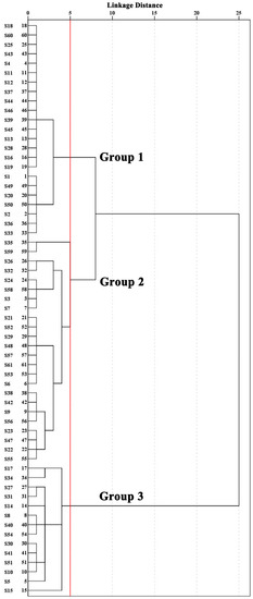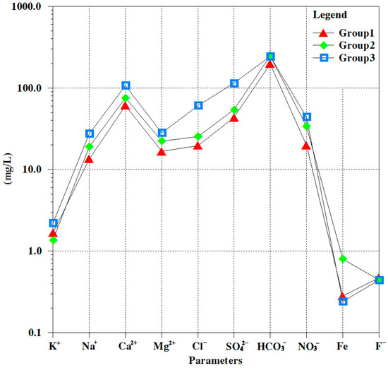 Cluster analysis was conducted on 61 groundwater samples collected during the 2010s. Ward’s method in SPSS version 21.0 [49] was applied to analyze the linkages between groups and the square Euclidean distance was selected as the similarity measure [65,66]. The dendrogram obtained from the cluster analysis is shown in Figure 5. Herein, a linkage distance of 5 was selected, and three groups (Groups 1–3) were clustered. In addition, based on the mean ion concentrations in the groundwater samples from different clustering groups, a Schoeller diagram [67] (Figure 6) and a scatter diagram [68] (Figure 7) were plotted. Figure 6 shows the mean ion concentrations in each group, and Figure 7 reflects the impact of human activities through the Na+ normalized Cl− versus NO3−.