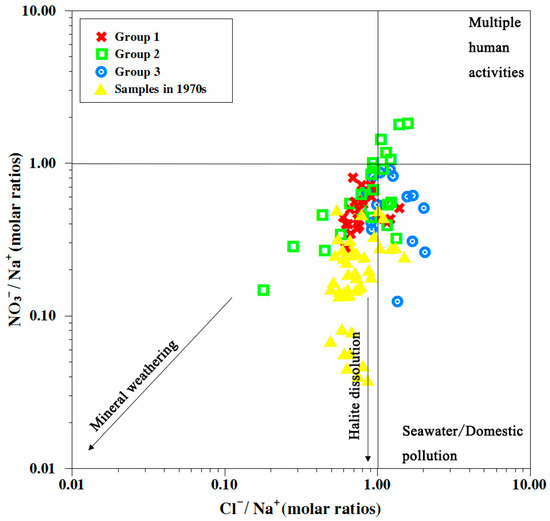 Scatter diagram of Cl−/Na+ versus NO3−/Na+ for groundwater samples.