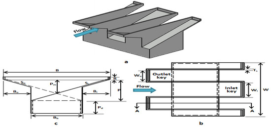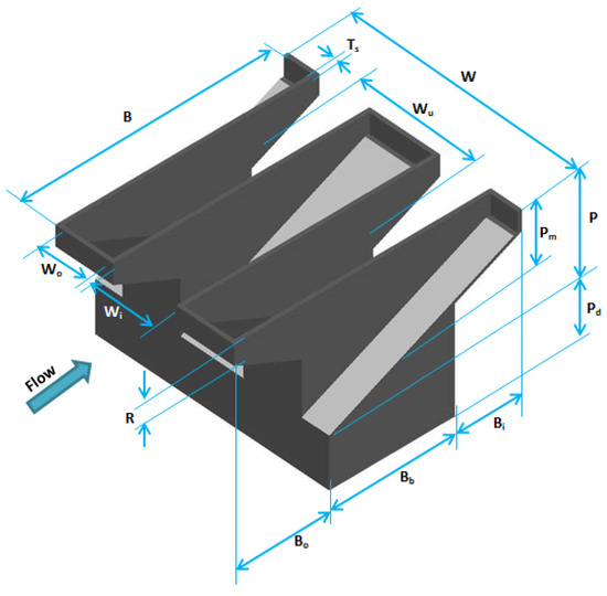 The flow was facilitated by a pump originating from the primary reservoir. Gate valves regulated the flow (throttle valve) in a closed-loop water system. Flume discharge is measured using a calibrated rectangular weir and ultrasonic flowmeters. After entering the flume from the input tank via the flow disperser tool, the flow entered the flume over the RPKW model. After going through the rectangular weir, the return conduit system released the water into the main reservoir. Discharge varied between 5 and 23 L/s. Table 2 lists the geometric elements of the RPKW, as shown in Figure 2.