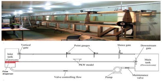 Tests were conducted in the glass flume at Kufa University’s Department of College Engineering for Water Resources and Hydraulic Structures. The flume measured 15 m long, 0.3 m wide and 0.45 m high. Reservoirs at the flume’s start and end regulate intake and output. The flume’s glass sides facilitate the observation of hydraulic phenomena and the water level profile. Figure 3 illustrates the fundamental structure of the flume.