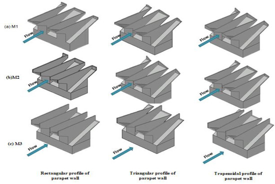A 3D printing method is a new innovative option for hydraulic experimental modelling that may provide a more adequate and quick model creation, particularly for models that have complicated geometries. The present study used 3D printing technology to fabricate hydraulic scaled models intended for experimental purposes within a laboratory setting. Various types of weir models were fabricated. This study analysed the effects of the parapet wall’s linearity on PKW performance. Three alternative parapet wall configurations with a total of 27 RPKW type-A models were included in the current study. Table 3 presents a testing matrix that includes all weirs that require testing. The experiments used three different parapet wall profiles with flat crests: rectangular, triangular and trapezoidal. The parapet wall’s profile form was analysed with respect to three distinct heights, i.e., R1 = 1.5 cm, R2 = 3 cm and R3 = 4.5 cm (R/P = 0.12, 0.24 and 0.36). As shown in Figure 4, the placement of parapet walls on a weir crest can be achieved through three modes, covering the (a) full crest (M1), (b) sides and inlet keys and (c) sidewalls only.