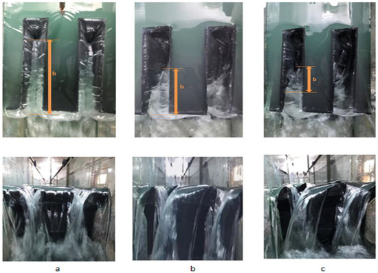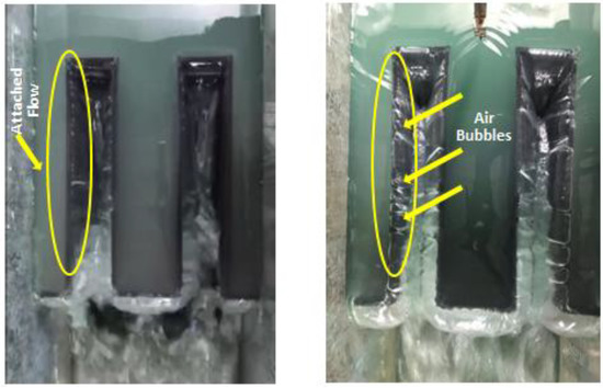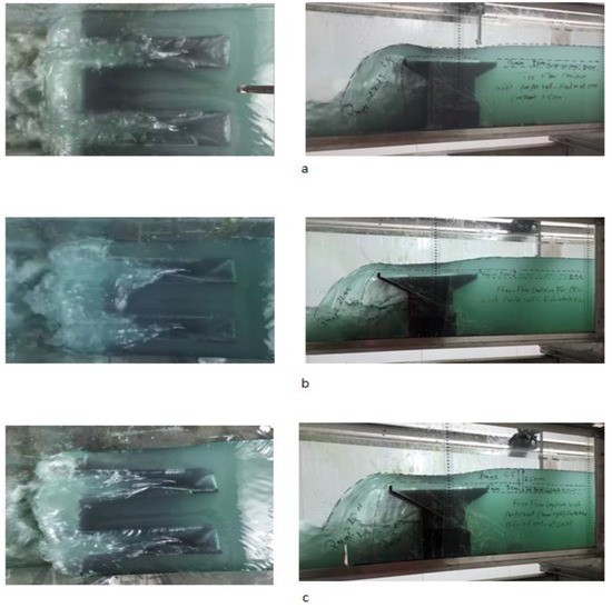 As a result, a parapet wall with a higher and steeper gradient (a triangle profile form) produced a better discharge efficiency. With a parapet wall and utilising its linearity of profile shape for a PKW with a set weir height, this is analogous to raising the overall weir height gradually to a point where the discharge capacity is maximised, which was consistent with the findings of Machiels and colleagues [14]. In consideration of the parapet walls’ primary effect and its linearity for profile forms, a parapet wall above the inlet crest raises the water level in the inlet key, thus reducing longitudinal velocity and optimising the discharge efficiency of the lateral and outlet crests. The flow patterns of three profile shapes of PKW parapet walls at low and high flow rates are shown in Figure 10 and Figure 11. Given the limited discharge rate, the flow of water is observed equitably spread over each overflow crest in the case of PKW’s rectangular profile form. By contrast, nappes that are thoroughly ventilated are generated downstream from the outlet key for the model’s triangular and trapezoidal profile forms. In the downstream region of the inlet, partially aerated linked nappes that exhibit oscillatory behaviour over time are generated. With this type of flow, the outflow is slightly increased due to the negative pressure beneath the water’s nappes; however, it also runs the risk of causing vibration and structural damage to the structure [26]. Nevertheless, addressing this situation with a deviation in the direction and intensity of flow nappes due to the linearity of the profile disperses and reduces the occurrence of vibration. Compared with the trapezoidal model, which has a small cavity, the triangular form has the biggest empty internal area. Most rectangular profiles formed downstream of the entry key are filled when the flow rate is high because the vertical parapet wall (particularly in rectangular cases) and its linearity (in trapezoidal and triangular cases) direct the upward jet and sideward; by contrast, the inlet crest’s vertical flow velocity component rises, resulting in a wider water jet from the inlet key for the same flow compared with that without the parapet walls.