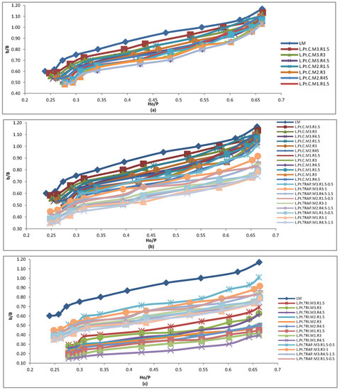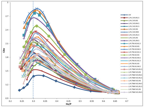 To perform subsequent analysis of parameters for evaluating the performance of the physical model based on the efficiency of the piano key weir’s discharge capacity, 27 PKW models were manufactured with parapet walls considering their linear geometric characteristics (side view shapes). Figure 7 shows that the PKW’s Cdw depends on the Ho/P ratio of the water head. It shows the parapet walls’ impact. The discharge coefficient was greatly enhanced by the addition of parapet walls, resulting in a marked increase in the PKW’s discharge capacity. Discharge coefficients vary depending on the profile shape and height of the parapet walls in the PKW models.