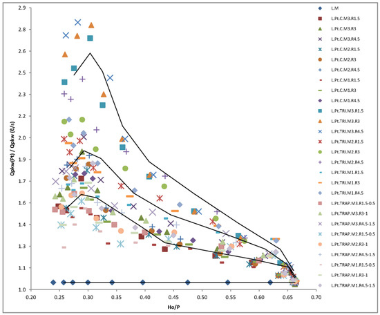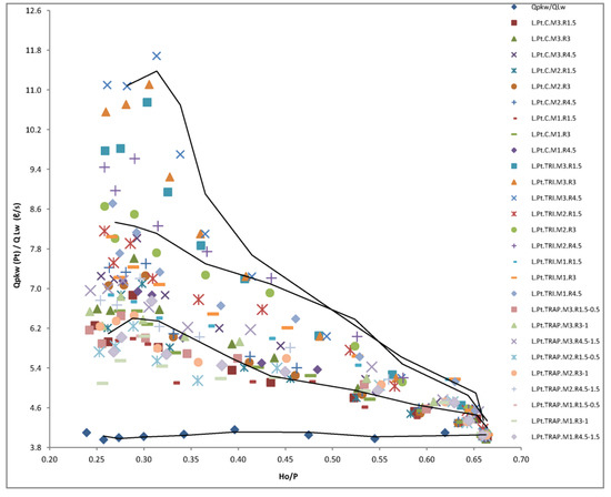 Relationship between QPKW(Pt)/QLW and Ho/P for the different heights and profile shapes of the parapet wall of RPKW models.