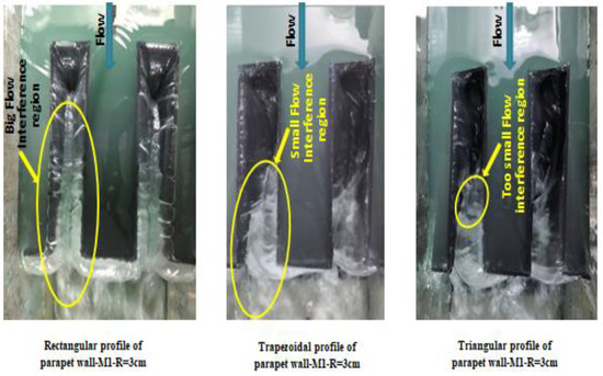 However, when parapet walls were fixed on the weir crest using a trapezoidal and triangular profile, the overlapping area of the lateral flow was smaller in the trapezoidal profile case than in the case of the rectangular profile. It almost diminishes in the case of the triangular profile, in addition to the small area of overlapping when compared with the trapezoidal and especially the rectangular profile.