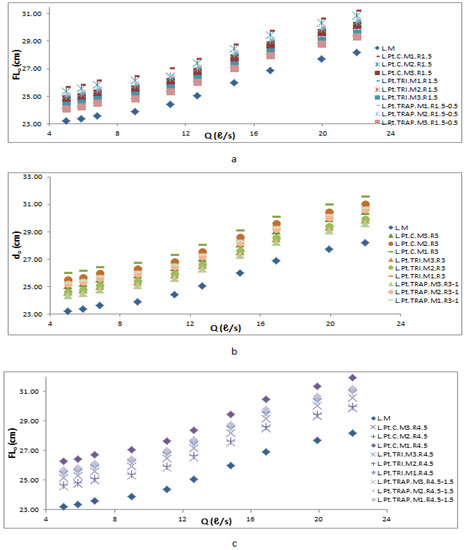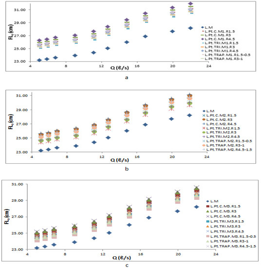 Figure 13 and Figure 14 show the water levels of the PKW’s upstream in relation to the flume’s base (FL0) for different discharges in the absence of a parapet, with three instalment modes of parapet walls (M1, M2 and M3) for three R/P ratios (0.12, 0.24, and 0.36). In all construction versions, the parapet walls and linearity raised the water level upstream of the weir. Table 4 shows the average percentage rises in water level and total upstream flow in the setup compared with that without parapet walls.