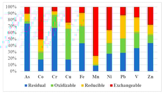 Results of the sequential extraction suggest that As (74.2%), Cr (67.3%), Zn (43.8%), Fe (43.6%) and V (36.1%) were mostly concentrated in F4. This suggests that outcropping rocks were the main source of such elements. Moreover, geochemical speciation data suggest that the high percentage of some elements (Co (50.7%), Mn (76.2%) and Ni (36.2%)) in F1 might have had a detrimental impact on aquatic biota. These elements have high affinity with carbonates and, therefore, can co-precipitate within carbonate minerals when released from their source [].