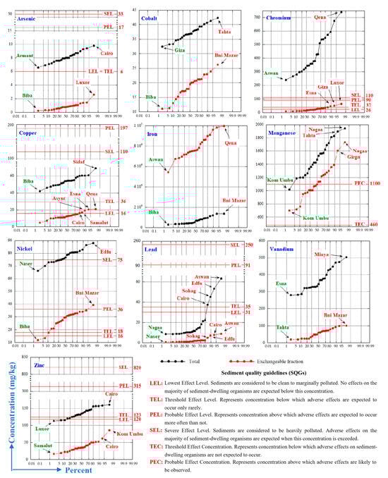 The total concentrations of Cr were markedly above all SQGs. However, in relation to the exchangeable fraction, all samples had concentrations lower than the SQGs, except for Luxor, Giza and Esna, where LEL and TEL thresholds were exceeded. Similarly, Mn was generally present in high concentrations in Nile River stream sediments. However, this was larger in the exchangeable fraction and, therefore, most of the samples passed the PEC threshold. Consequently, considering only the exchangeable fraction and based on SQGs, there is a potential risk to aquatic species linked only to the presence of high concentrations of Mn. However, when the total concentration is taken into account, the risk is linked not only to Mn, but also to Ni, and particularly to Cr.