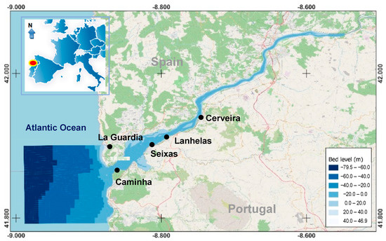 The Minho River is an international river that forms a natural border between Portugal and Spain in its last 70 km, with its mouth located between Caminha in northern Portugal and La Guardia in the Galician region of Spain. The Minho River has a total length of 340 km, and its average discharge flow is 300 m3/s, ranging from 100 m3/s in the summer season to 500 m3/s in the winter. While the river’s flow depends on the precipitation in the region, it is significantly regulated by the dams along the river, with the Frieira Dam situated 80 km upstream from the river’s mouth playing a critical role in this regulation [13].