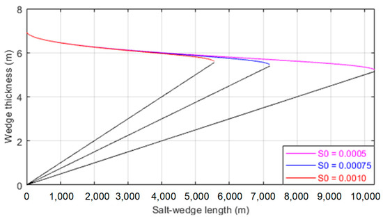 Saline intrusion lengths of 10,320 m, 7200 m, and 5555 m were obtained for bed slopes of 0.0005, 0.00075, and 0.0010, respectively.