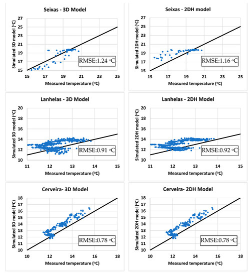 Comparison between measured water temperature and results from 2DH and 3D models in Seixas, Lanhelas, and Cerveira for 2DH and 3D models.