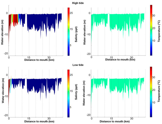 This study demonstrated that the 2DH and 3D models could simulate the water temperature patterns influenced by tides and river flows, albeit with slight differences. The water temperature results revealed that the 3D model exhibited smaller errors; however, it was observed that the difference between the models decreased further upstream, where the length of the saline intrusion was determined. In this context, both models displayed poorer performances in the upstream area. This finding agrees with recent studies that also reported challenges in accurately modeling temperature patterns in estuaries (e.g., [34,35]).