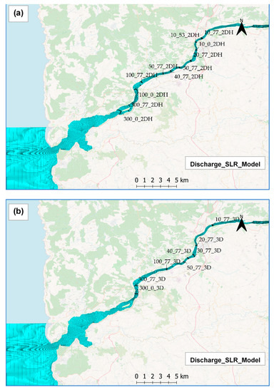 Saline intrusion extent, considering a 0.5 ppt concentration limit. Labeled as the river flow discharge (m3/s), SLR (cm), and model applied: (a) 2DH model; (b) 3D model.