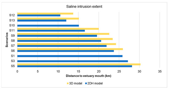 The 3D model’s results show greater extents of saline intrusion than the 2DH model when comparing the same scenario (Figure 8), with the differences increasing in the scenarios with less saline intrusion, ranging from 7% in S5 to 30% in S12. The river flow discharges in both models were the main driver for increasing the extent of saline intrusion.