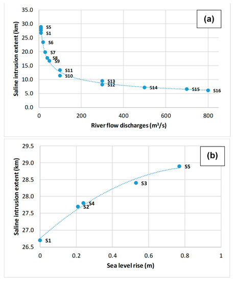 Figure 9 provides a comprehensive overview of the results obtained from all simulated scenarios, focusing on the influence of the factors under investigation: (a) river flow and (b) mean SLR. The figure effectively highlights the impacts of these factors and their interplay on the observed outcomes, demonstrating the nonlinear relation between these factors and the extent of saline intrusion.