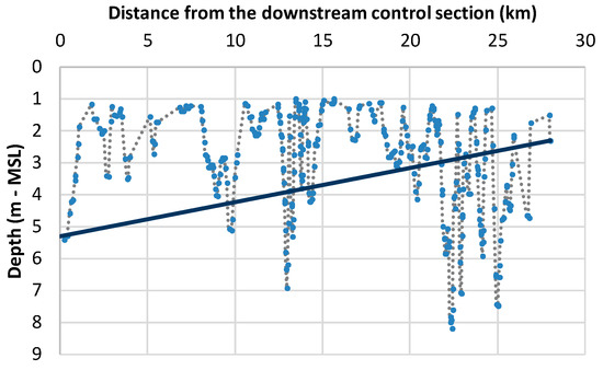 Applying the analytical/numerical solution derived from the classical theoretical approach for idealized flat estuaries requires a proper definition and quantification of all the parameters involved. In this work, the average channel slope and estuarine width were defined assuming a linear slope between the depth at the control section and the upstream depth (Figure 10) and through the quotient between the surface area at mean sea level and the estuarine axis length, respectively (so = 0.0001 and width = 630 m).
