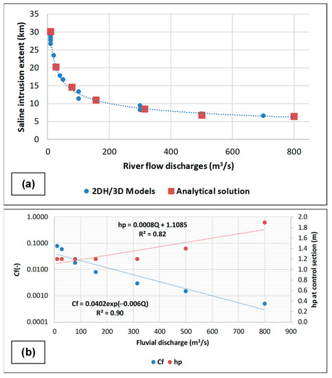 Results of saline intrusion in the Minho River estuary. (a) Extension of saline intrusion as a function of river flow obtained by both 2DH/3D models and calibrated analytical/numerical solution; (b) obtained Cf and initial hp value functions of river discharge for the Minho River estuary.