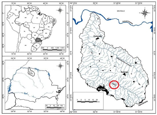 The Pirapo watershed has a total area of 5098.10 km2. The Pirapó River rises in the municipality of Apucarana and runs 168 km to the mouth of the Paranapanema River. The study was conducted in the Sanepar watershed on the Pirapo River in the state of Paraná in southern Brazil (Figure 1).