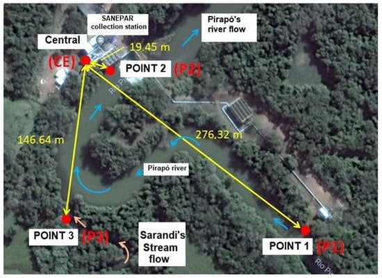 For P1, the exact location was chosen where Sanepar collects water from the Pirapó River, before the confluence of the Sarandi stream. This is referred to as EEB-00. The location of P2, called EEB-01, where the lifting pumps for the treatment plant are installed, was chosen by Sanepar and is situated at the confluence of the Sarandi stream. Finally, P3 is located on the left bank of the Sarandi stream, as suggested by the Sanepar technician.