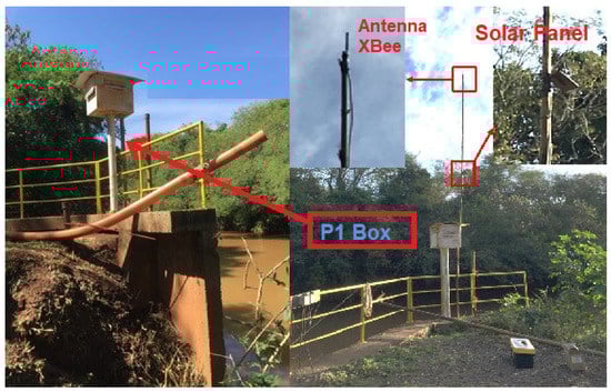 The sensor node installed at P1 started operating on 7 July 2018, along with the central node. The antenna for the XBee® (Lindon, UT, USA) module and the solar panel were installed on a bamboo pole that was attached to the existing structure, as shown in Figure 3. The height of the antenna was close to four meters and the solar panel was positioned with an orientation to the north and an incline of 30°. Due to the availability of accommodation at the location chosen to be Point 1, the circuit installed at that point did not need to use a cabinet for external installation, as illustrated in P1-BOX in Figure 3.
