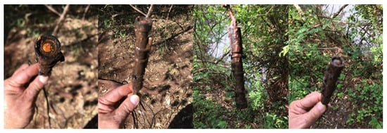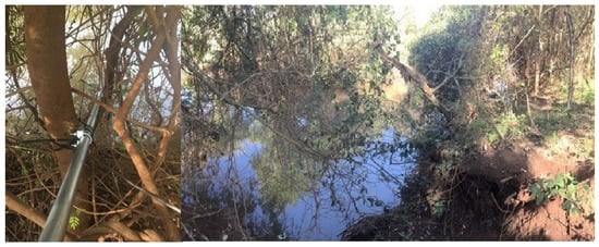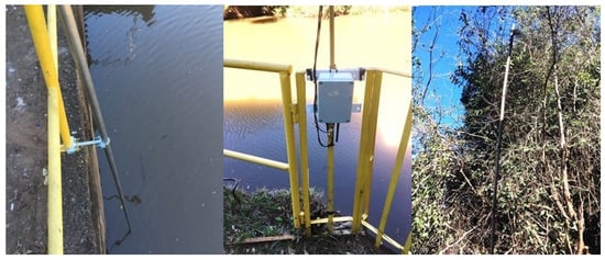 The installation of the sensor node at P3 (Sarandi stream) was the most laborious, as there was no infrastructure for installing the equipment. Access to the site was also more difficult, as crossing a pasture area and entering the riparian forest was necessary, as shown in Figure 5. The sensors were immersed to a depth of thirty-five centimeters to the surface of the stream water. The sensor node installed at P3 started operating on 7 July 2018. The temperature and dissolved oxygen sensors were inserted inside a galvanized steel tube with an 11/4″ diameter, 1.2 mm wall, and six meters long, fixed in a tree on the bank of the Sarandi stream, as shown in the Figure 5 on the left. The sensors were immersed at a depth of thirty-five centimeters concerning the water surface of the stream.