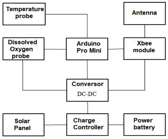 The sensor node consists of a microcontroller Arduino [,,,,,,,,,], a temperature sensor (DS18B20), an Atlas Scientific [] dissolved oxygen sensor, an XBee® module, an omnidirectional antenna, a DC-DC converter, a charge controller, a solar panel, and a battery, and is illustrated in Figure 6.