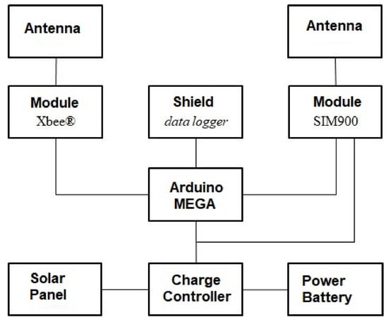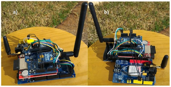 Using a data logger shield and a shield for XBee® facilitated the connections of these modules with the Arduino Mega, as shown in Figure 9a. Figure 9b illustrates the connection of the SIM900 module with the Arduino Mega, made using cables.